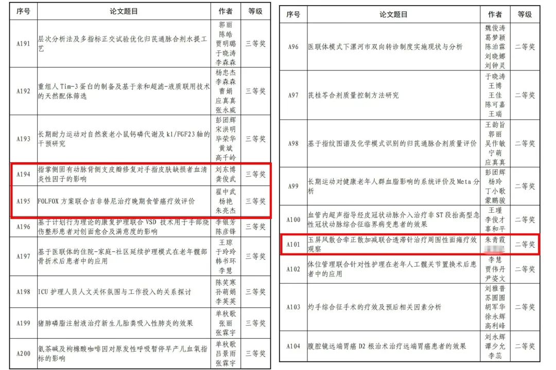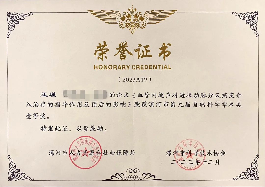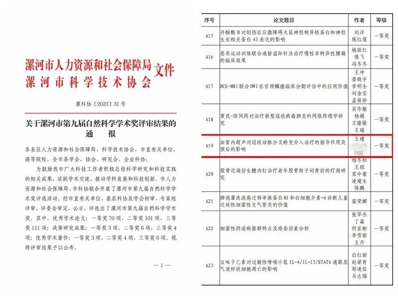 近日,漯河市人力資源和社會保障局、漯河市科學技術協(xié)會公布漯河市第九屆自然科學學術獎優(yōu)秀學術論文評選結果。市二院院長王瑾《血管內超聲對冠狀動脈分叉病變介入治療的指導作用及預后的影響》、《血管內超聲指導經(jīng)皮冠狀動脈介入治療非 ST 段抬高型急 性冠狀動脈綜合征臨界病變患者的效果》分別榮獲一等獎和二等獎;中醫(yī)針灸科主任朱青霞《玉屏風散合牽正散加減聯(lián)合透滯針治療周圍性面癱療效觀察》榮獲二等獎;腫瘤科副主任醫(yī)師翟中武《FOLFOX 方案聯(lián)合吉非替尼治療晚期食管癌療效評價》、顯微外科主治醫(yī)師劉東博的《指掌側固有動脈背側支皮瓣修復對手指皮膚缺損者血清炎性因子的影響》榮獲三等獎。