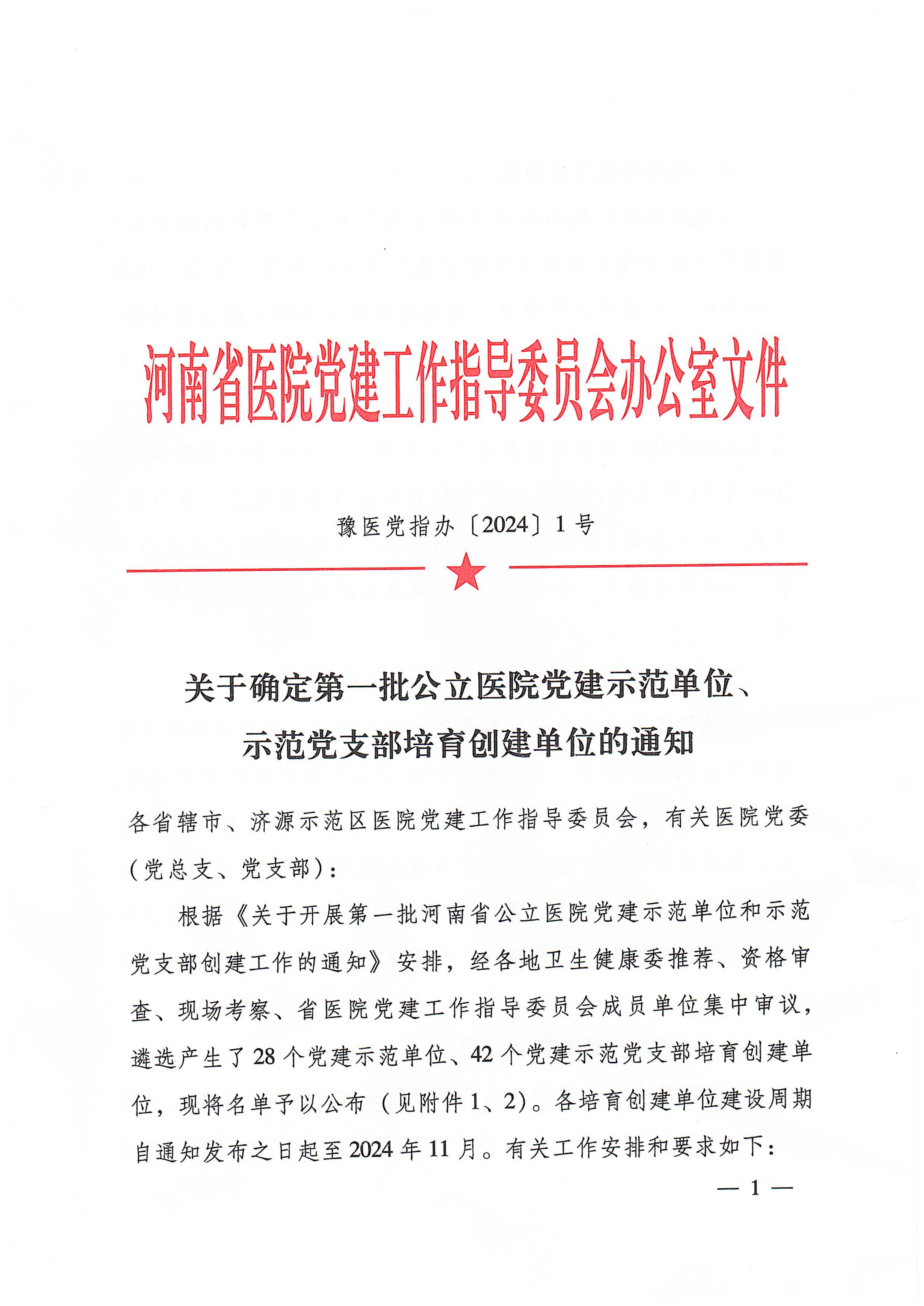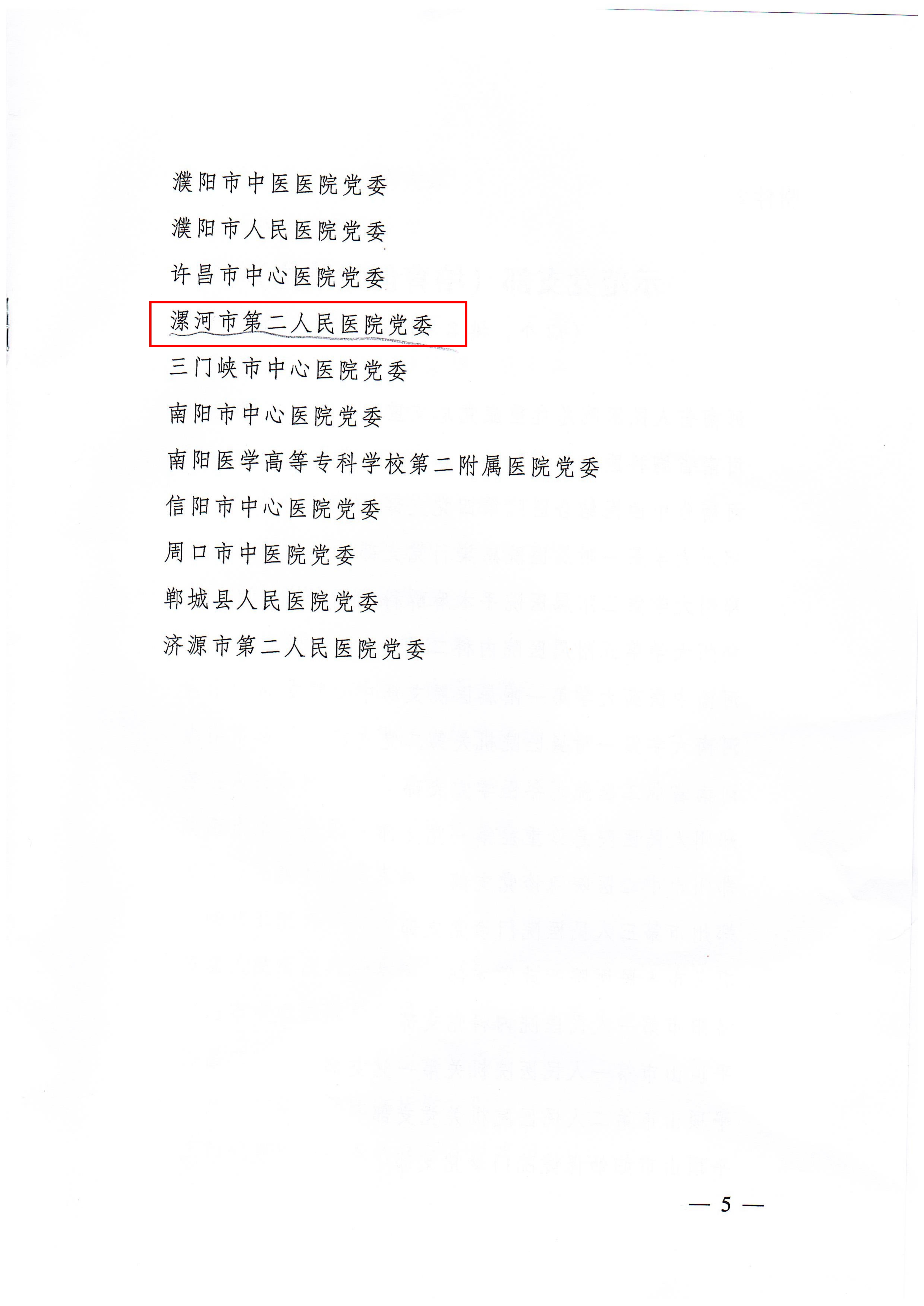 近日,河南省醫(yī)院黨建工作指導委員會下發(fā)《關于確定第一批公立醫(yī)院黨建示范單位、示范黨支部培育創(chuàng)建單位的通知》,市二院黨委被確定為河南省公立醫(yī)院黨建示范單位(培育創(chuàng)建單位),是全省28個黨建示范單位之一、漯河地區(qū)唯一。