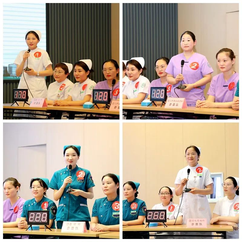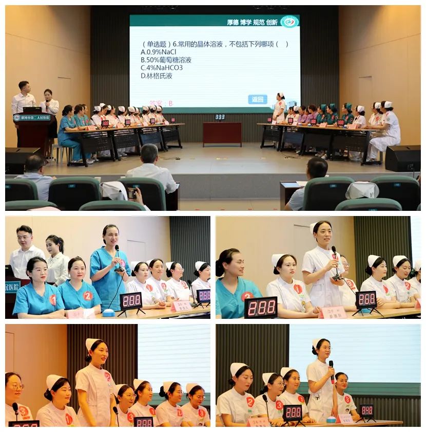 此次競賽內(nèi)容涵蓋基礎(chǔ)護理、??谱o理、護理團體標準、核心制度、應(yīng)急預(yù)案等專業(yè)知識,分為初賽和決賽。此次活動,共有25個護理單元75名選手參加,經(jīng)過前期的層層選拔,8支代表隊24名選手參加了決賽。比賽現(xiàn)場氣氛火熱,高潮迭起,必答題環(huán)節(jié)各隊選手平分秋色,比分不相上下,隨著搶答環(huán)節(jié)的到來,比賽進入白熱化狀態(tài),各隊選手快速思考,競相搶答,上演了一場精彩紛呈的腦力與速度的較量;在風險題環(huán)節(jié),各隊選手不甘落后,幾乎是在題目出現(xiàn)的瞬間就已經(jīng)有人按下了搶答器并給出準確的答案,體現(xiàn)他們扎實的理論知識和深厚的實踐功底。