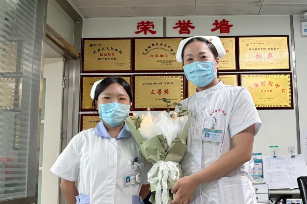 “趙老師,馬上就要轉(zhuǎn)科,真舍不得你,舍不得胸外科”,胸外科實(shí)習(xí)生龐晶晶依依不舍地對(duì)帶教老師趙蕊蕊說道,更是送上鮮花表達(dá)感謝。