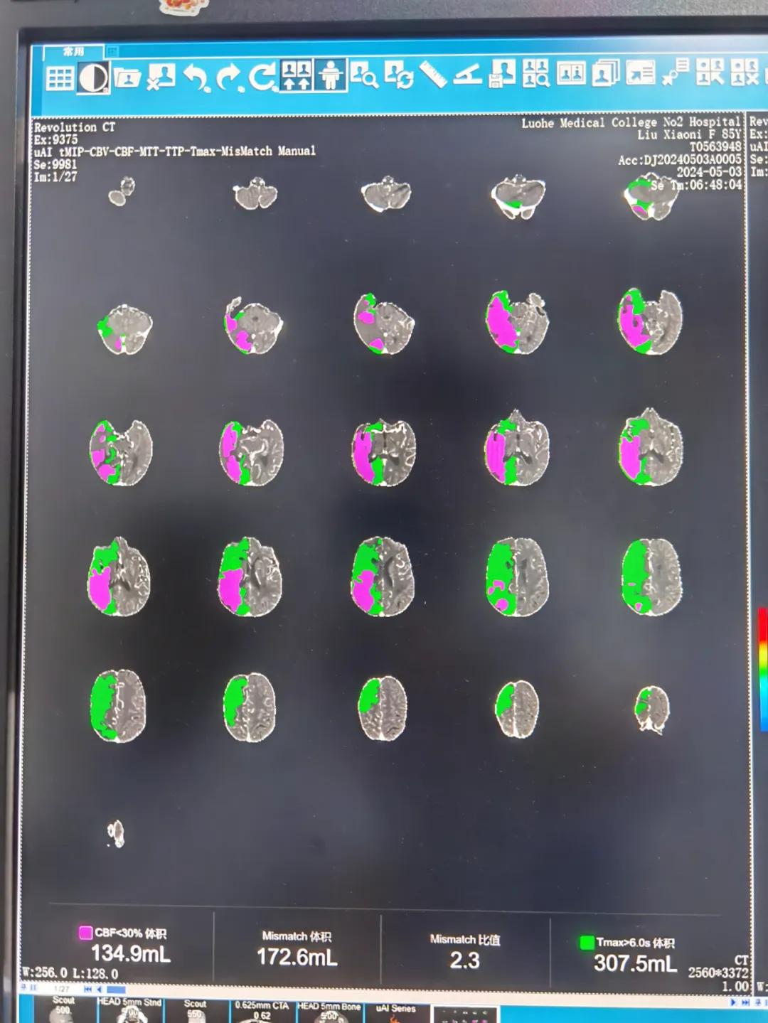 15:30左右,張先生手術(shù)剛結(jié)束不久,急診室里又來了一位54歲的女性患者,“右側(cè)肢體無力伴口角歪斜40分鐘”,行頭顱CT排除腦出血后,立即給予靜脈溶栓治。
