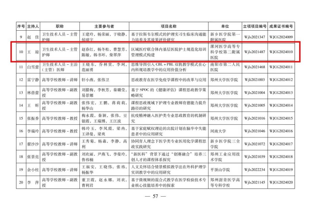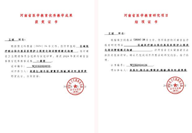 近日,河南省衛(wèi)生健康委員會(huì)下發(fā)了《關(guān)于公布2024年河南省醫(yī)學(xué)教育研究項(xiàng)目立項(xiàng)教學(xué)成果和優(yōu)質(zhì)課評(píng)選結(jié)果的通知》,由漯河市骨科醫(yī)院(漯河醫(yī)專二附院、漯河市立醫(yī)院)王瓊、趙春紅、楊冬松、曹慧芳、陳敏、韓書環(huán)、柴翠萍團(tuán)隊(duì)完成的《區(qū)域醫(yī)療聯(lián)合體內(nèi)基層醫(yī)院護(hù)士規(guī)范化培訓(xùn)管理模式構(gòu)建》項(xiàng)目完成結(jié)項(xiàng),被授予2024年河南省醫(yī)學(xué)教育優(yōu)秀教學(xué)成果一等獎(jiǎng)。