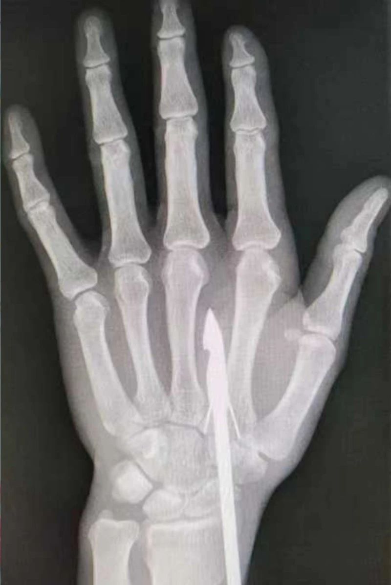 時(shí)間緊迫,每一秒的流逝都可能對(duì)傷者的手部功能造成不可逆的損害。接診醫(yī)生代彭威,迅速對(duì)傷者進(jìn)行了初步檢查。他注意到,魚鉤已經(jīng)深深嵌入皮膚,情況遠(yuǎn)比表面看起來(lái)復(fù)雜。沒有絲毫猶豫,立即安排了X線檢查以確認(rèn)魚鉤的位置及傷及范圍,以及急診化驗(yàn)檢查以評(píng)估患者的整體狀況。