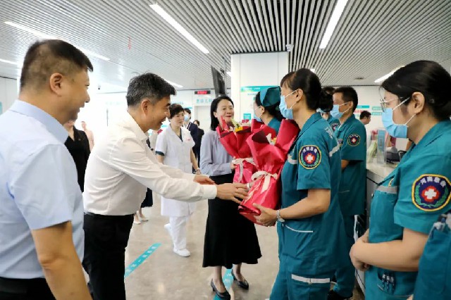 在急診科,宋耀生書記、于宏副主任向急救人員送上鮮花,對他們在急救救援和保障人民生命健康方面所做出的貢獻表示肯定。“急診科是衛(wèi)健系統(tǒng)和醫(yī)院的前沿陣地,你們時刻待命,聞令出擊,為患者救治爭分奪秒,大家辛苦了!”領導的話語溫暖著每一位急診醫(yī)師的心。