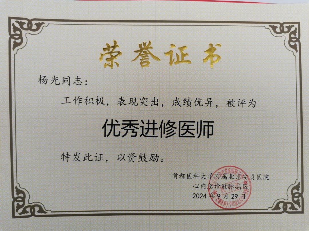 近日,市二院心血管內(nèi)科主治醫(yī)師楊光在首都醫(yī)科大學(xué)附屬北京安貞醫(yī)院完成為期一年的進修學(xué)習(xí),現(xiàn)順利結(jié)業(yè)、學(xué)成歸來,因在進修期間表現(xiàn)優(yōu)異,被評為北京安貞醫(yī)院“優(yōu)秀進修醫(yī)師”榮譽稱號,不僅為醫(yī)院全體青年醫(yī)師樹立了榜樣,同時也給醫(yī)院心內(nèi)科專業(yè)發(fā)展注入新的活力,將所學(xué)轉(zhuǎn)化為生產(chǎn)力,把新知識、新技術(shù)傳播開來,讓更多患者受益。