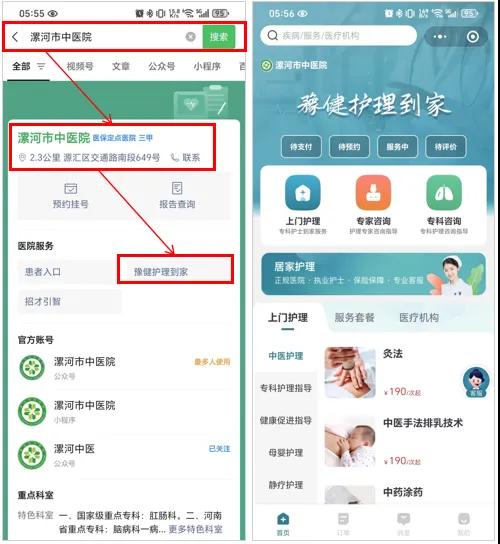 方法2:微信公眾號搜索“漯河市中醫(yī)院”,關注公眾號→點擊進入“豫健護理到家”平臺