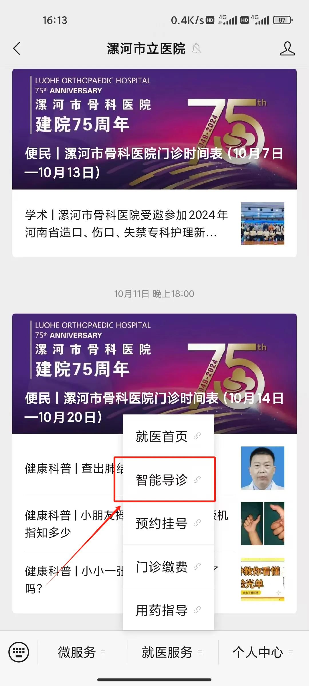 (1)關(guān)注微信公眾號(hào)點(diǎn)擊就醫(yī)首頁,進(jìn)入公眾號(hào)主頁,點(diǎn)擊智能導(dǎo)診;