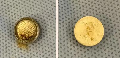 上圖為進入鼻腔20分鐘的紐扣電池,已經(jīng)滲出強腐蝕性堿性液體,長時間會引起局部組織缺失和軟骨破壞,導致組織粘連或瘢痕形成,嚴重時引起鼻中隔穿孔等并發(fā)癥。