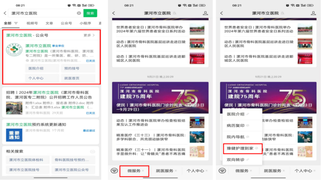 1.微信公眾號搜索“漯河市立醫(yī)院”,進入公眾號點擊“微服務(wù)”,選擇“豫健護理到家”。