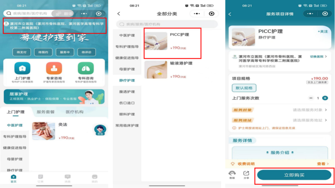 2.進入后查看醫(yī)院是否正確,以下內(nèi)容以PICC護理為例:選擇PICC護理,點擊立即購買。