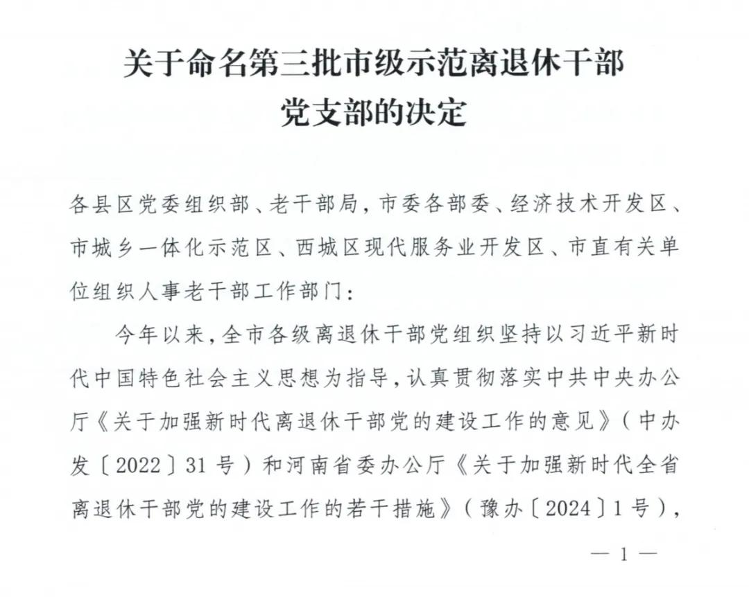 近日,市委組織部、市委老干部局印發(fā)了《關(guān)于命名第三批市級示范離退休干部黨支部的決定》(漯老〔2024〕32號),市二院離退休第一黨支部被評為第三批市級示范離退休干部黨支部,同時也是漯河市衛(wèi)生健康系統(tǒng)唯一受到表彰命名的單位。