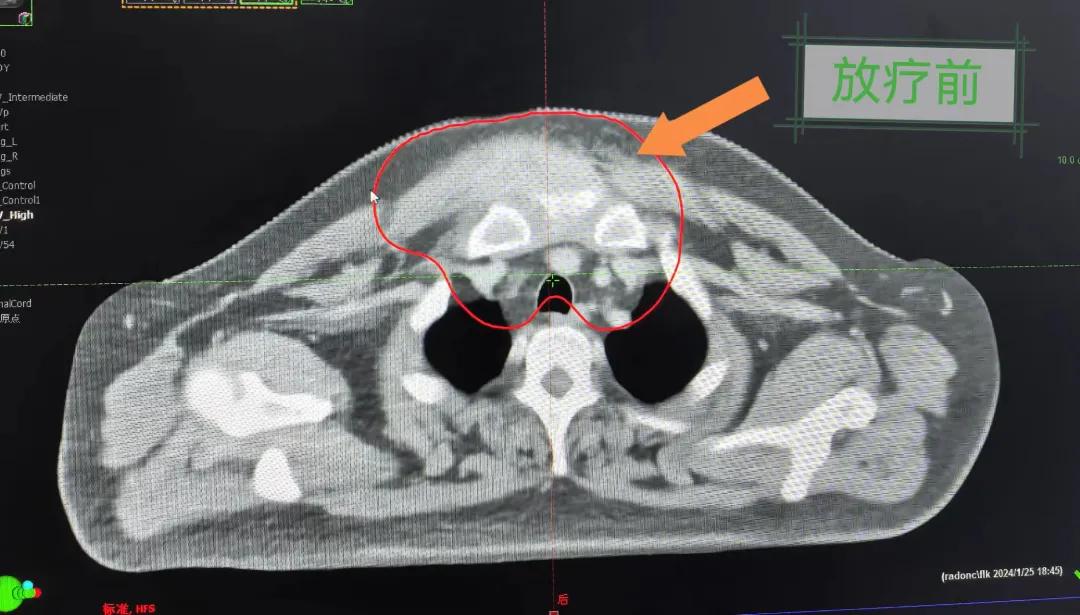 患者經(jīng)多方咨詢與打聽,在家屬的陪同下來到市二院放療科找到趙亮主任尋求幫助。入院后迅速完善了相關(guān)檢查,診斷為罕見的“胸壁腫瘤”。因腫瘤體積大,侵犯周圍組織,手術(shù)治療難度較大,經(jīng)院內(nèi)多學(xué)科會診后,決定采用無創(chuàng)的局部放射治療。在初步告知患者及家屬治療方案時,病人及家屬都擔(dān)心預(yù)后及放療可能引起的不適,趙亮主任詳細且耐心的向家屬和病人講述放療過程中可能出現(xiàn)的不良反應(yīng),確保讓他們安心治療。