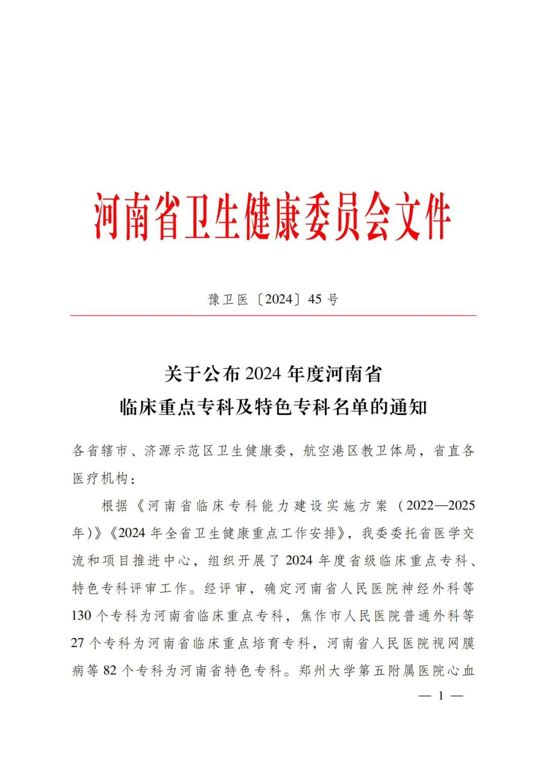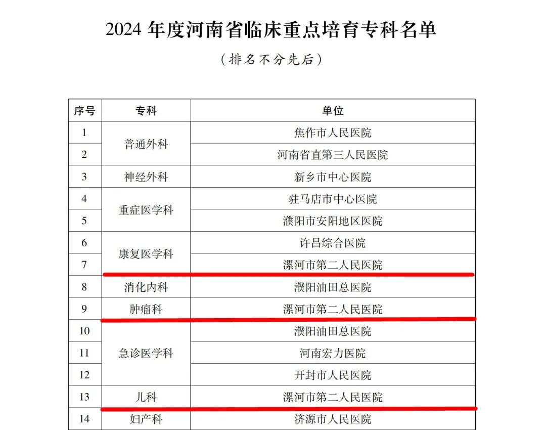 12月24日,河南省衛(wèi)生健康委下發(fā)了《關(guān)于公布2024年度河南省臨床重點??萍疤厣珜?泼麊蔚耐ㄖ罚ㄔバl(wèi)醫(yī)〔2024〕45號)。市二院兒科、腫瘤科(腫瘤放療科、腫瘤內(nèi)科)、康復(fù)醫(yī)學(xué)科成功通過評審,被確定為河南省臨床重點培育專科。