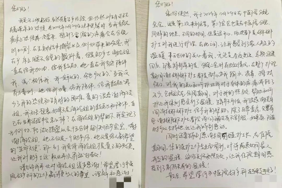 手寫的感謝信表達(dá)了對護(hù)士長周麗婭暖心細(xì)致的全程護(hù)理服務(wù),助產(chǎn)士朱海玲專業(yè)的助產(chǎn)技術(shù)及心理支持,助力寶寶平安生產(chǎn)以及謝娜娜護(hù)士耐心細(xì)致的護(hù)理和陪伴,讓她十分感動,住院期間感受到了家的溫暖和如親人般的陪伴。這些都如涓涓細(xì)流滋潤著寶媽和家屬的心田,并以寫信的方式表達(dá)對婦產(chǎn)科團(tuán)隊(duì)優(yōu)質(zhì)護(hù)理服務(wù)的認(rèn)可。