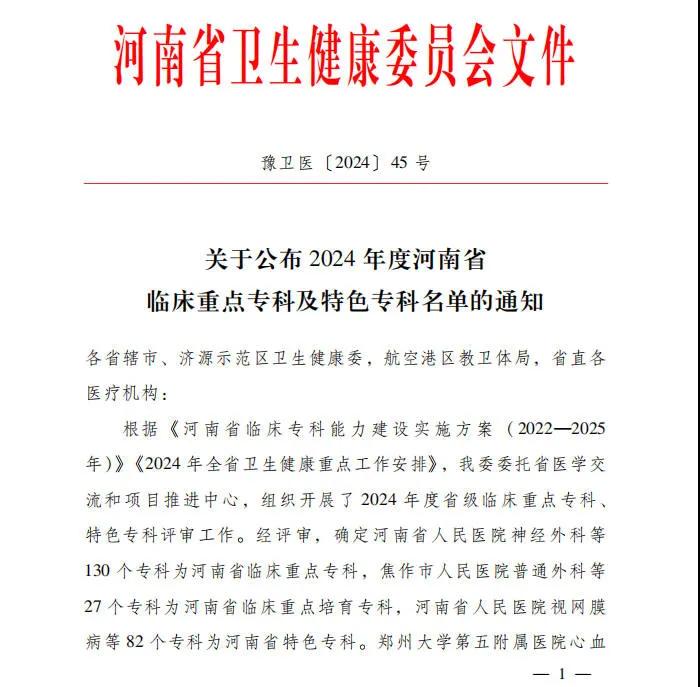 12月24日,河南省衛(wèi)生健康委下發(fā)《關(guān)于公布2024年度河南省臨床重點專科及特色??泼麊蔚耐ㄖ罚ㄔバl(wèi)醫(yī)〔2024〕45號)。漯河醫(yī)專高等??茖W(xué)校第二附屬醫(yī)院運(yùn)動醫(yī)學(xué)科、護(hù)理??瞥晒νㄟ^評審,被確定為河南省臨床重點培育???。