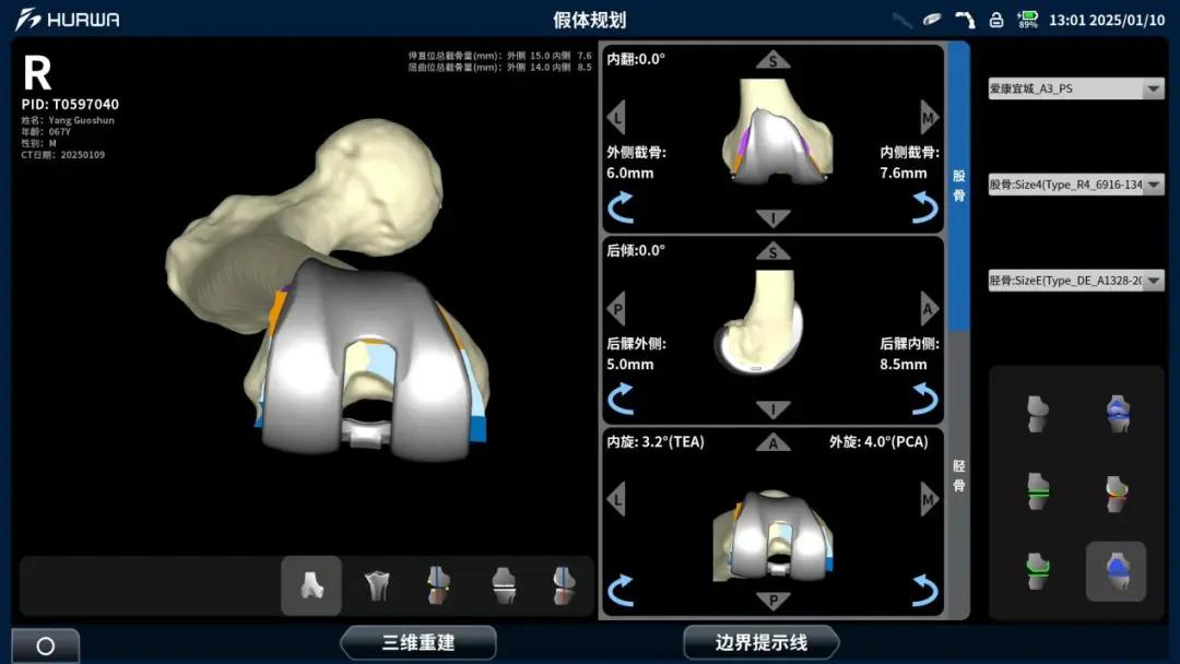 該患者是一位膝關(guān)節(jié)骨性關(guān)節(jié)病的男性,他的膝關(guān)節(jié)疼痛時間有10年之久,在當(dāng)?shù)亟?jīng)過反復(fù)的治療,針灸,外敷膏藥,打封閉針等保守治療,效果不佳,并且癥狀越來越重,以至于嚴(yán)重影響正常生活和活動。后來經(jīng)過親戚的介紹,患者來到了漯河市骨科醫(yī)院關(guān)節(jié)外科門診,經(jīng)過李付彬主任醫(yī)師詳細(xì)檢查,膝關(guān)節(jié)軟骨和半月板損傷較重,膝關(guān)節(jié)出現(xiàn)了內(nèi)翻畸形,經(jīng)過李主任團(tuán)隊(duì)的討論確定了詳細(xì)的治療方案,一致認(rèn)為可以在機(jī)器人輔助下進(jìn)行膝關(guān)節(jié)表面置換術(shù)。在整個手術(shù)過程中完全是按照術(shù)前規(guī)劃進(jìn)行,手術(shù)過程非常順利。目前患者已經(jīng)開始下床負(fù)重進(jìn)行康復(fù)訓(xùn)練了。