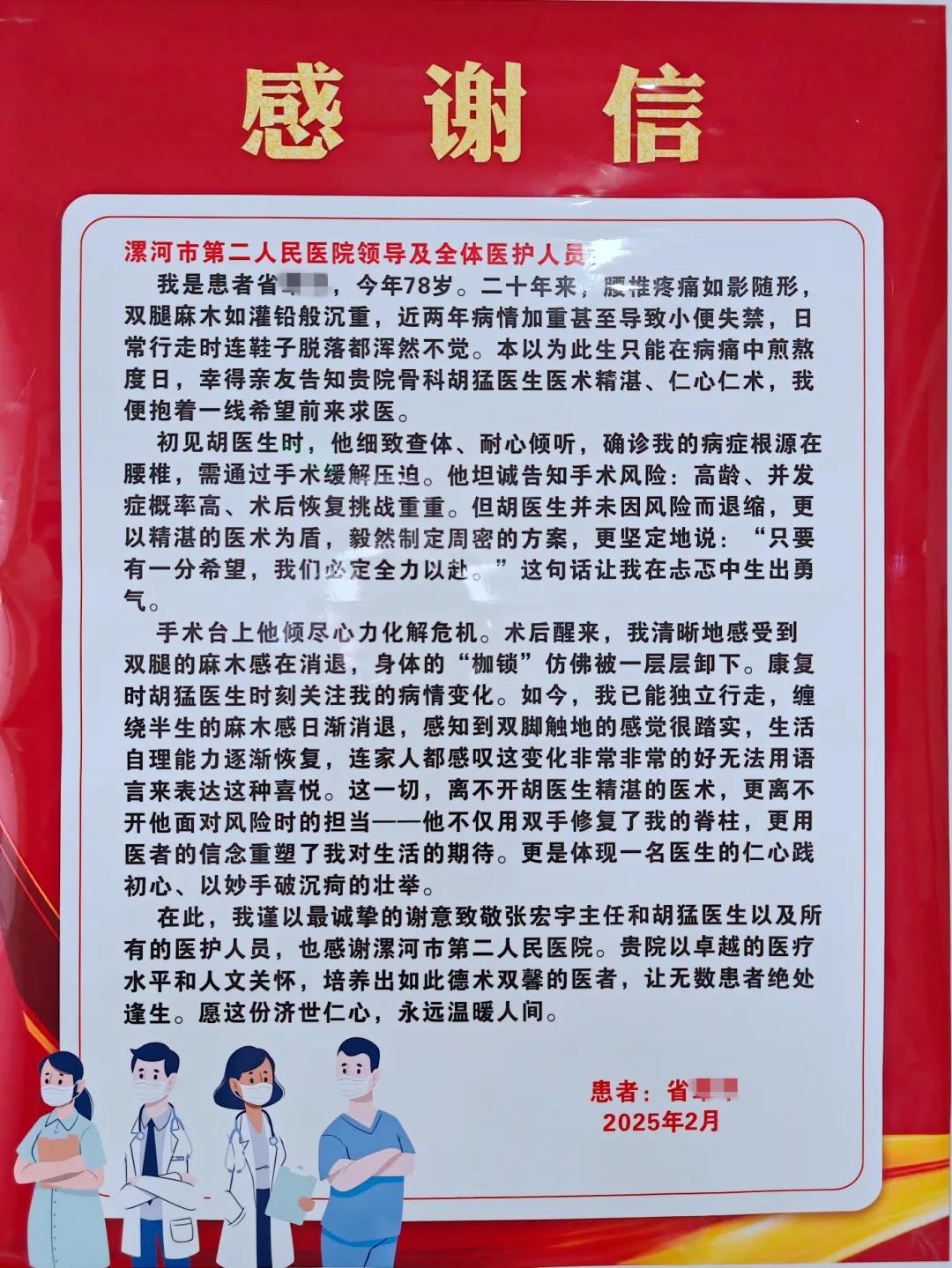 近日,家住西華的患者省奶奶,因椎管狹窄于市二院骨科成功完成單側(cè)雙通道脊柱內(nèi)鏡下腰椎管減壓術(shù),取得良好效果,家屬特地送來錦旗和感謝信,表達(dá)他們的感激之情。