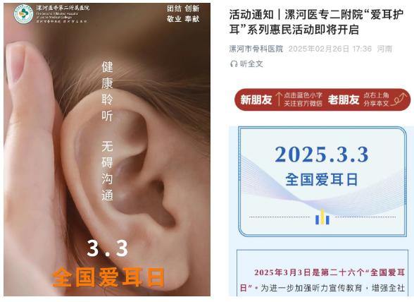 3月3日是第26個(gè)全國“愛耳日” ,為進(jìn)一步普及聽力健康科學(xué)知識(shí),增強(qiáng)全社會(huì)聽力殘疾預(yù)防意識(shí)和預(yù)防能力,漯河醫(yī)專二附院(漯河市骨科醫(yī)院、漯河市立醫(yī)院)耳鼻咽喉科牽頭開展了一系列內(nèi)容豐富、形式多樣的愛耳日宣傳教育活動(dòng)。