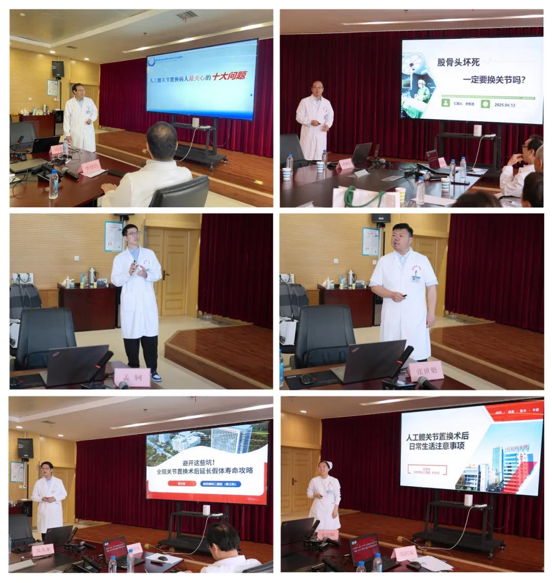 隨后,精彩紛呈的科普講座環(huán)節(jié)正式開(kāi)啟。張紹安主任率先圍繞 “人工髖關(guān)節(jié)置換患者最關(guān)心十大問(wèn)題” ,從手術(shù)原理到術(shù)后康復(fù),深入淺出地解答了病友們心中的疑惑。李智浩主任則聚焦 “保頭或換髖如何選擇” 以及 “人工髖關(guān)節(jié)置換術(shù)后肌力訓(xùn)練” 這兩個(gè)關(guān)鍵話題,進(jìn)行了細(xì)致入微的分析。幫助病友們了解不同治療方案的優(yōu)劣,掌握科學(xué)的康復(fù)訓(xùn)練方法。吳大龍醫(yī)生帶來(lái)的 “避開(kāi)這些坑!全髖關(guān)節(jié)置換術(shù)后延長(zhǎng)假體壽命攻略”,可謂是滿滿的干貨。他用通俗易懂的語(yǔ)言為病友們傳授實(shí)用的經(jīng)驗(yàn),讓大家明白如何在日常生活中更好地保護(hù)假體。孟軻醫(yī)生講解 “髖關(guān)節(jié)置換術(shù)后預(yù)防假體脫位常識(shí)”,從細(xì)節(jié)入手,強(qiáng)調(diào)預(yù)防的重要性。張世魁醫(yī)生的 “如何有效‘補(bǔ)鈣’”,讓病友們了解到補(bǔ)鈣對(duì)于骨骼健康的關(guān)鍵作用以及正確的補(bǔ)鈣方法。王瑩輝護(hù)士長(zhǎng)分享 “髖關(guān)節(jié)置換術(shù)后日常生活注意事項(xiàng)”,涵蓋了衣食住行各個(gè)方面,為病友們的術(shù)后生活提供了貼心指導(dǎo)。