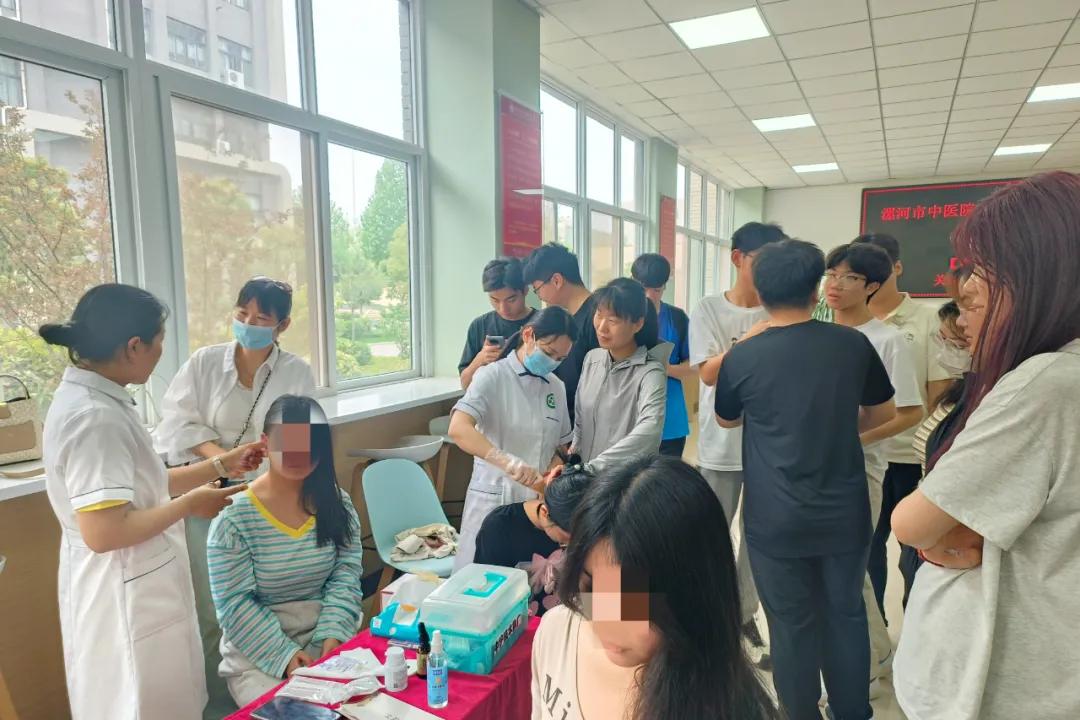 本次活動(dòng)精心組織了由頭痛失眠科、中醫(yī)內(nèi)科、針灸推拿科、皮膚科、疼痛科、外科、男性科等多學(xué)科專(zhuān)家組成的醫(yī)療團(tuán)隊(duì),為師生提供專(zhuān)業(yè)診療服務(wù)?;顒?dòng)當(dāng)天,漯河市中醫(yī)院門(mén)診部七大科室的專(zhuān)家們?cè)缭绲貋?lái)到了現(xiàn)場(chǎng),準(zhǔn)備迎接前來(lái)咨詢(xún)的師生們?,F(xiàn)場(chǎng)人頭攢動(dòng),每個(gè)科室前都排起了長(zhǎng)隊(duì)。專(zhuān)家們耐心細(xì)致地詢(xún)問(wèn)病史、查體、開(kāi)具處方,他們不僅現(xiàn)場(chǎng)解答了師生們的疑問(wèn),還傳授了一些中醫(yī)養(yǎng)生和保健的知識(shí)?,F(xiàn)場(chǎng)特別設(shè)置了中醫(yī)特色治療體驗(yàn)區(qū)和中醫(yī)藥衍生產(chǎn)品展示區(qū),通過(guò)推拿、針灸等傳統(tǒng)療法體驗(yàn)讓師生們親身體驗(yàn)中醫(yī)拔罐、刮痧、艾灸等特色療法,活動(dòng)過(guò)程中還穿插健康知識(shí)宣講,發(fā)放了健康知識(shí)宣傳頁(yè),向師生們普及了常見(jiàn)病、多發(fā)病的預(yù)防、健康養(yǎng)生知識(shí)。
