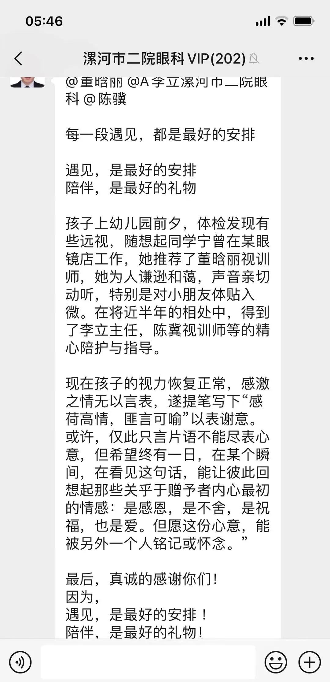 經(jīng)過半年多的康復(fù)訓(xùn)練,祺寶雙眼視力均提升到了該年齡段的正常水平0.5。祺寶的爸爸非常激動(dòng),為了表達(dá)對市二院眼科視覺康復(fù)中心全體醫(yī)護(hù)人員的感激之情,他親手創(chuàng)作了兩幅字畫,并在微信群發(fā)送了感謝信,代表了家長對醫(yī)護(hù)人員的深深敬意,更見證了市二院眼科團(tuán)隊(duì)在視覺康復(fù)領(lǐng)域的專業(yè)與付出。