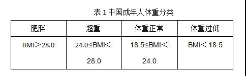 體重變化是判斷一段時(shí)期內(nèi)能量平衡與否最簡(jiǎn)便易行的指標(biāo),也是判斷吃動(dòng)是否平衡的指標(biāo)。目前常用的判斷健康體重的指標(biāo)是體質(zhì)指數(shù)(body massindex, BMI),它的計(jì)算方法是用體重(kg)除以身高(m)的平方。我國(guó)健康成年人(18~64歲)的BMI應(yīng)在18.5~23.9 kg/m2(表1),65歲以上老年人的適宜體重和 BMI應(yīng)該略高(20~26.9kg/m2)。