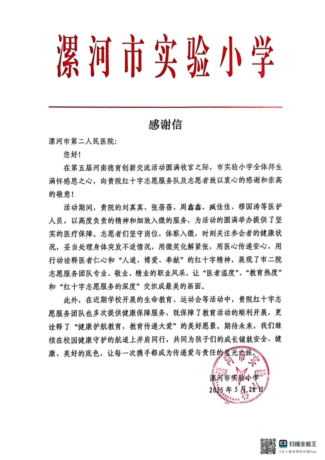 近日,市二院收到漯河市實(shí)驗(yàn)小學(xué)發(fā)來(lái)的感謝信,對(duì)醫(yī)院紅十字志愿服務(wù)隊(duì)及劉真真、張蓓蓓、周鑫鑫、戚佳佳、穆國(guó)濤等醫(yī)護(hù)人員在第五屆河南德育創(chuàng)新交流活動(dòng)中的專業(yè)表現(xiàn)和無(wú)私奉獻(xiàn)表示高度贊揚(yáng)。