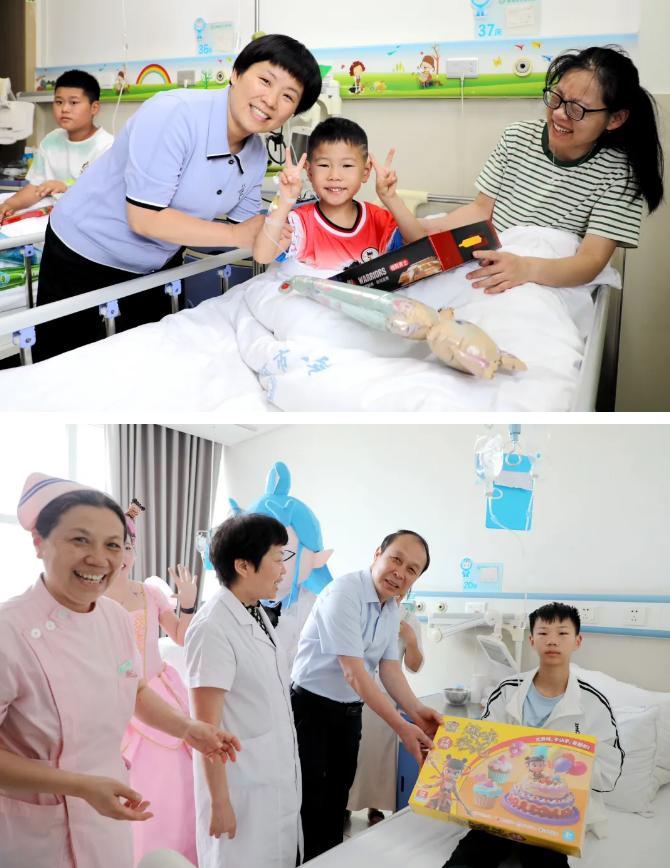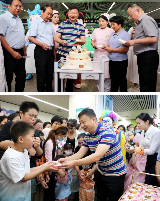 在孩子們期待的目光中,黨委書記魏松、院長(zhǎng)胡海英攜班子成員和兒科專家們?yōu)楹⒆觽円黄鹎邢虏⒎窒砉?jié)日蛋糕,“愿寶貝們心里有愛,眼里有光,永遠(yuǎn)做自己的小太陽!”真摯的祝福隨蛋糕甜香漫溢全場(chǎng)。
