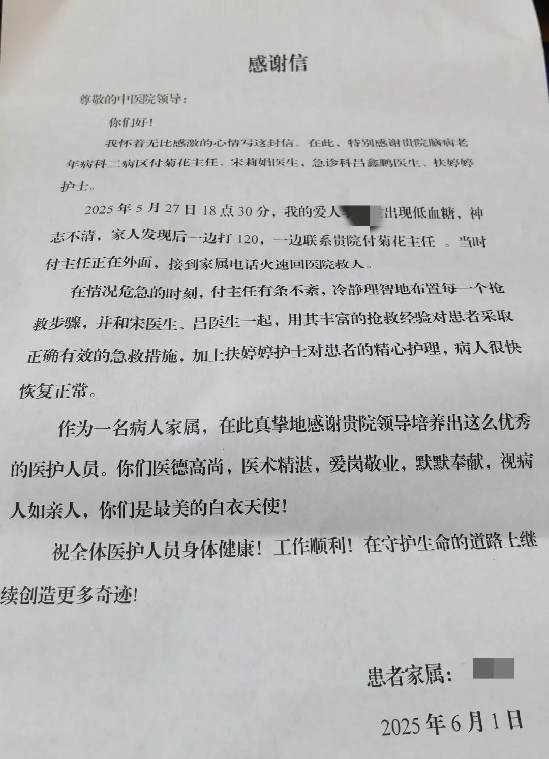 據(jù)了解,該女士其丈夫患腦血管疾病,曾在市中醫(yī)院腦二科就診,是腦二病區(qū)付菊花主任的病人,后多次到腦二科找付醫(yī)生復(fù)診。5月27日晚,患者病情危急,患者家屬趕忙聯(lián)系付菊花,付菊花當(dāng)時(shí)已下班回家,她接到電話后立即與院急診科和腦二科宋莉娟醫(yī)生聯(lián)系開(kāi)展相關(guān)救治工作并抓緊到醫(yī)院參與救治,還用“醫(yī)生全年無(wú)休守護(hù)患者”的暖心話語(yǔ)安慰焦急的患者家屬。急診科的呂鑫鵬、扶婷婷也對(duì)患者采取正確有效的急救措施及精心護(hù)理,經(jīng)過(guò)各科室的精心救治,患者癥狀快速好轉(zhuǎn),病人家屬特送來(lái)信表示感謝。