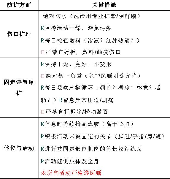 骨折術(shù)后拆線前的階段(通常為術(shù)后7-14天)是傷口愈合和早期穩(wěn)定的關(guān)鍵時(shí)期,特別是未拆線出院的患者做好自我防護(hù)至關(guān)重要,能有效預(yù)防感染、促進(jìn)愈合、避免并發(fā)癥。以下是詳細(xì)的自我防護(hù)清單: