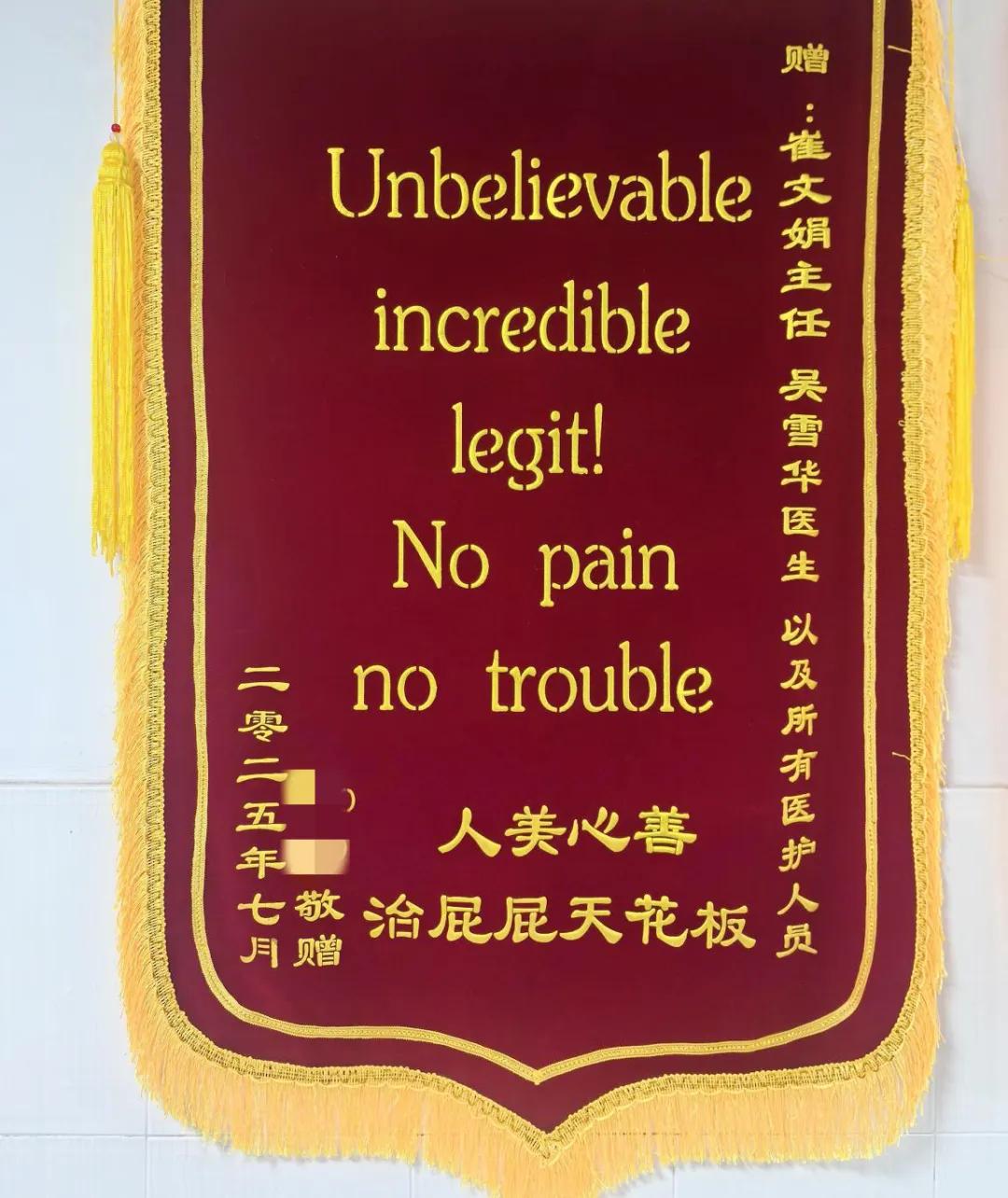 熟悉肛腸科的人都知道,這里時(shí)常因患者的 “巧思” 充滿歡樂,近期科室就接連收到了好幾面別具一格的錦旗。其中一面寫著 “Unbelievable incredible legit!No pain no trouble 人美心善 治屁屁天花板”,中西結(jié)合的表達(dá)既俏皮又真誠;還有一面則用 “手術(shù)不疼換藥不疼,肛好有你高水平!” 的諧音巧語傳遞謝意。這些充滿趣味的錦旗文字,從側(cè)面印證了肛腸科在創(chuàng)面疼痛管理方面取得了良好成效,也是患者對我們診療服務(wù)的肯定認(rèn)可。