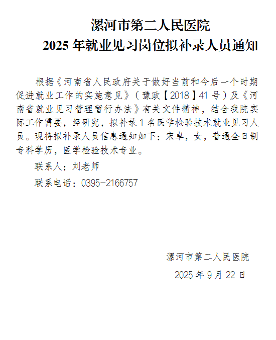 【公示】漯河市第二人民醫(yī)院2025年就業(yè)見習崗位擬補錄人員通知