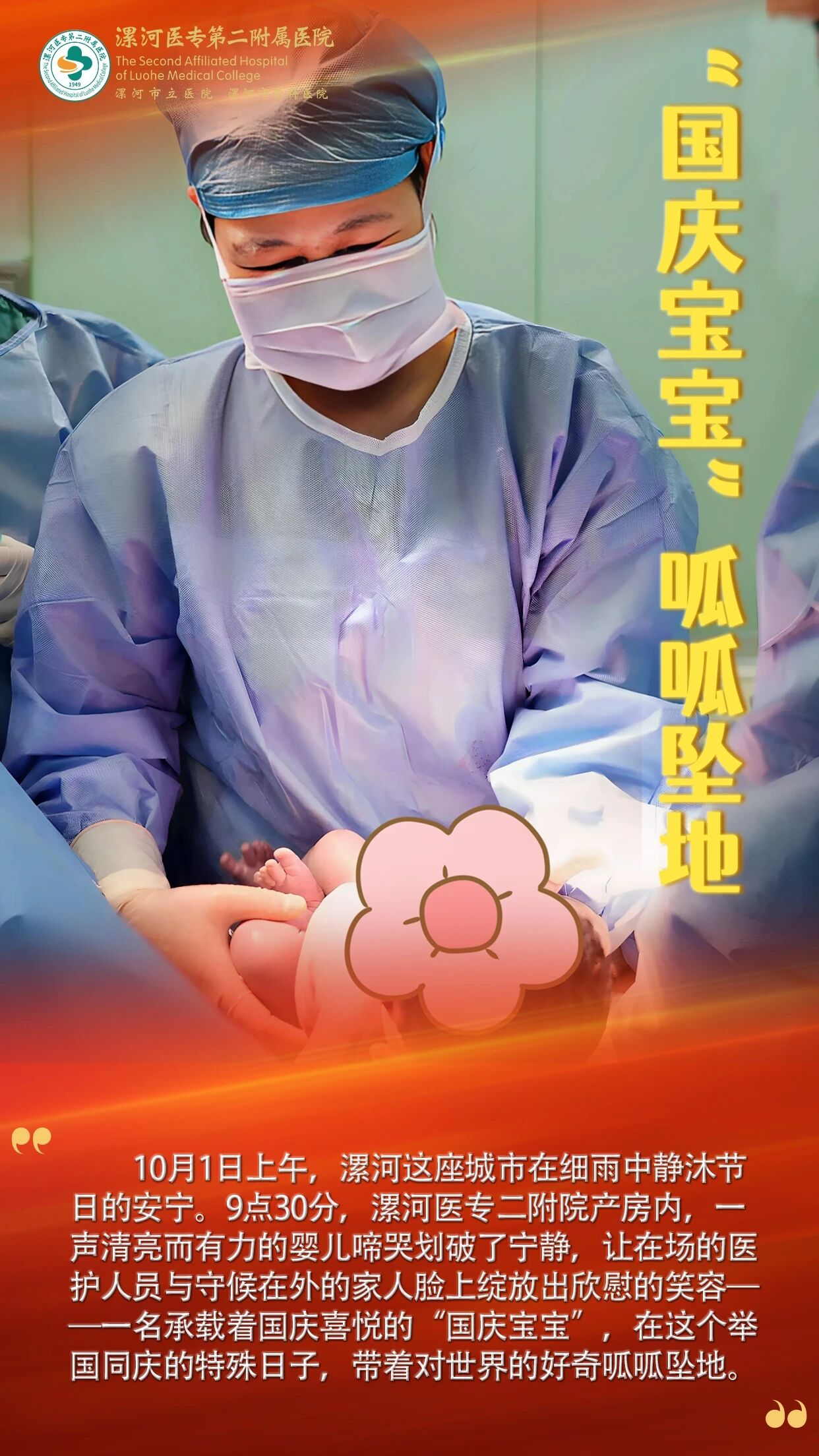 10月1日上午,漯河這座城市在細雨中靜沐節(jié)日的安寧。9點30分,漯河醫(yī)專二附院產(chǎn)房內(nèi),一聲清亮而有力的嬰兒啼哭劃破了寧靜,讓在場的醫(yī)護人員與守候在外的家人臉上綻放出欣慰的笑容——一名承載著國慶喜悅的“國慶寶寶”,在這個舉國同慶的特殊日子,帶著對世界的好奇呱呱墜地。