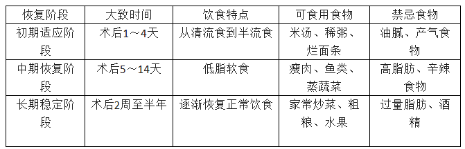 1.術(shù)后第1~2天,腸道功能尚未恢復(fù),此時(shí)通常需要禁食,待腸蠕動(dòng)恢復(fù)、肛門排氣后,可開(kāi)始進(jìn)食清流食。