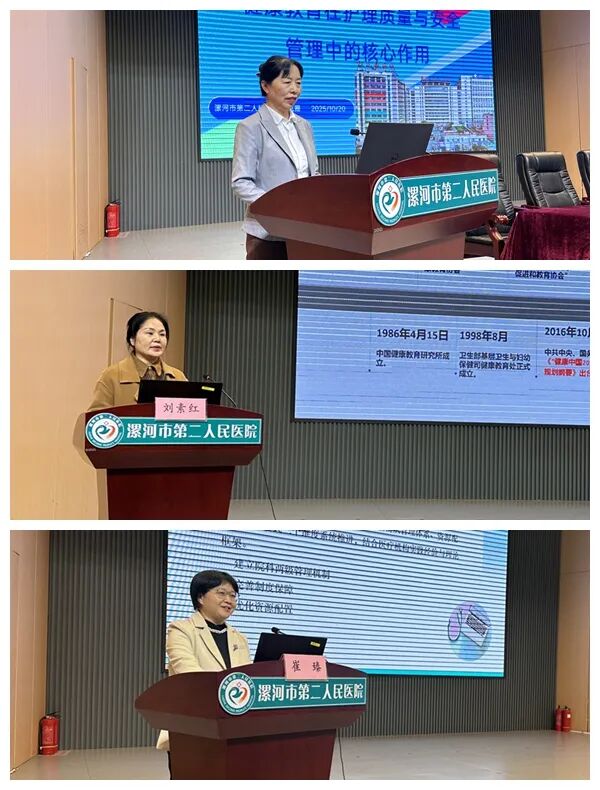 在學術交流環(huán)節(jié),多位護理專家圍繞健康教育的新理念、新方法與新技術展開深入探討。市二院護理部主任高凱霞分享了《健康教育在護理質量與安全管理中的核心作用》;市中心醫(yī)院護理部副主任劉素紅講解了《基于賦能理論構建三級醫(yī)院健康教育護士健康素養(yǎng)提升路徑》;市六院護理部副主任崔臻以《賦能·融合——構建新時代醫(yī)院護理健康教育體系的實踐與思考》為題進行交流;臨潁縣人民醫(yī)院護理部副主任張潁歌介紹了《基于行為窗口理論的護士高效能溝通技巧》;市二院普外科護士長王書霞圍繞《腫瘤患者營養(yǎng)與身心健康:吃出健康,動出活力》展開講解;麻醉手術部副護士長莫敬敬探討了《基于指南的靜脈治療健康教育及溝通模式》;小兒外科骨干護士張小玉則就《智能時代,如何讓健康科普“活”起來?——AI在護理領域的創(chuàng)新實踐》進行分享。專家們結合臨床實例,展示了健康教育的最新成果與實踐經驗,內容充實,視角多元,為參會者帶來深刻啟發(fā)。