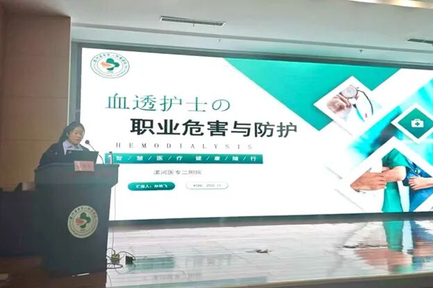 漯河醫(yī)專二附院血液凈化室骨干孫艷飛圍繞《血透護士的職業(yè)危害與防護》展開講解,從各個層面系統(tǒng)梳理了血透護士面臨的職業(yè)風險,并提出了具體、可行的防護措施與建議,呼吁在全力關愛患者的同時,務必重視自身的職業(yè)安全與身心健康,體現(xiàn)了深刻的人文關懷精神和團隊管理智慧。由臨潁縣中醫(yī)院血液凈化室護士長陳莉與舞陽縣中醫(yī)院血液凈化室護士長張銳主持會議。