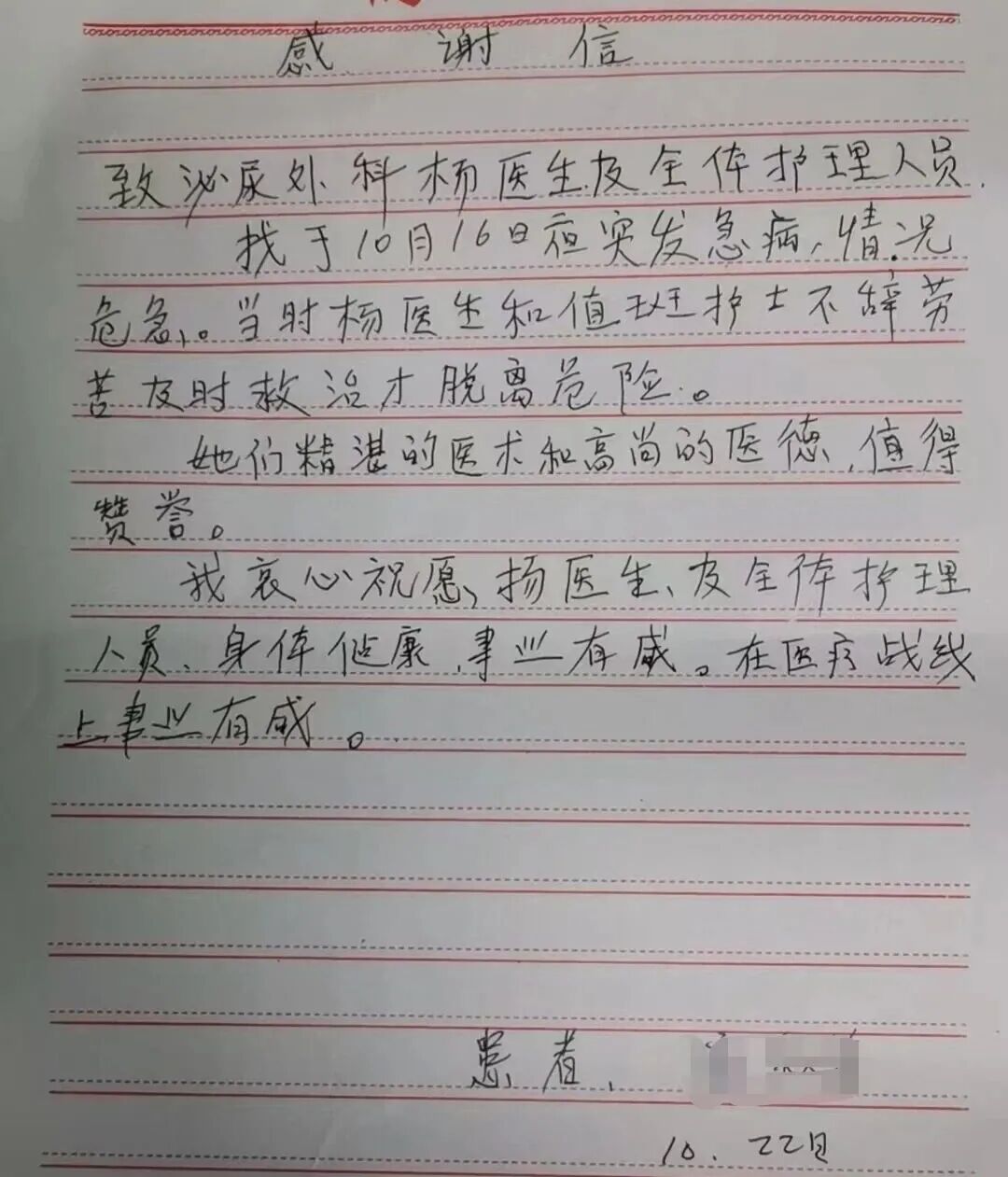 為感謝楊艷霞醫(yī)生的及時救治和護士們的貼心照顧,出院后患者特意寫下一封感謝信,字里行間滿是對楊醫(yī)生專業(yè)醫(yī)術(shù)、敬業(yè)精神和人文關(guān)懷的由衷贊譽,也表達了對醫(yī)院泌尿外科醫(yī)療服務(wù)的高度認(rèn)可。