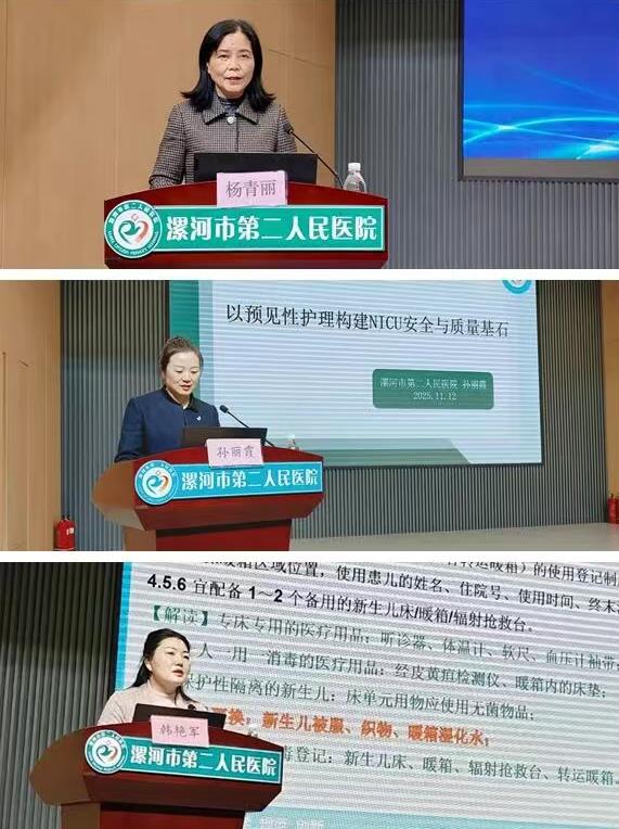 學術交流環(huán)節(jié),市中心醫(yī)院NICU護士長楊青麗以《新生兒低血糖臨床規(guī)范管理專家共識》(2021)為題,系統(tǒng)闡述了新生兒低血糖的“預防、篩查、干預、隨訪”四個重點;市二院護理部副主任孫麗霞分享了《以預見性護理構(gòu)建NICU安全與質(zhì)量基石》,點明預見性護理是NICU生命安全保障的基石,也是質(zhì)量持續(xù)提升的第一道防線;市二院感控辦副主任韓艷軍以《新生兒病區(qū)醫(yī)院感染預防與控制標準》進行了交流,闡明要嚴守感控標準,筑牢安全防線,保障每一位新生兒的健康與安全;市婦幼保健院兒科護士長鄭文韜以《高危兒靜脈通路的合理選擇》展開,講解了高危兒靜脈通路的選擇,核心在于基于個體評估,實現(xiàn)安全與療效的最佳平衡;市二院靜療專科護士李艷結(jié)合《兒童靜療常見并發(fā)癥的預防及處理》,提出兒童靜療安全,核心在于以預防為首;市二院傷口造口專科護士馬美華分享了《兒童常見皮膚護理與管理》,闡述嚴守預防底線,踐行精細照護,是守護新生兒稚嫩肌膚、避免醫(yī)源性皮膚損傷的根本之道。