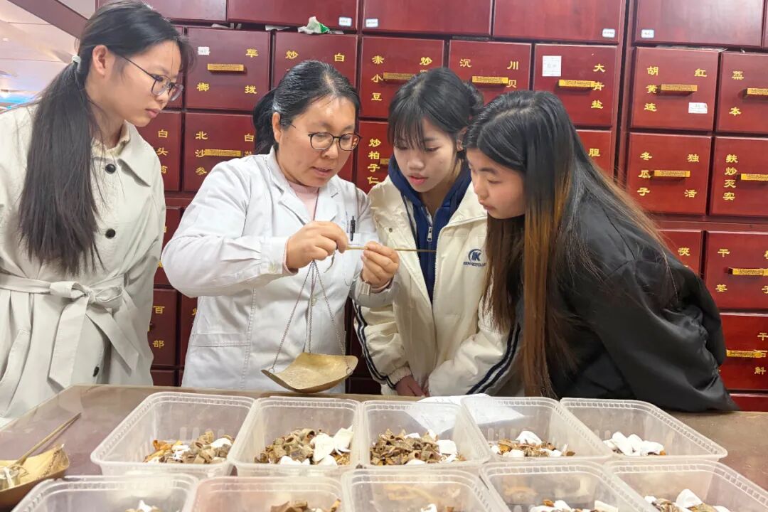 在市中醫(yī)院藥學(xué)部副主任白冰、陳志軍陪同下,師生們先后走進(jìn)精品藥房、散裝飲片藥房、西藥房、制劑藥房、藥庫(kù)及臨床藥學(xué)室。從貴細(xì)藥材的鑒別儲(chǔ)存、“戥子稱量”的傳統(tǒng)技藝,到現(xiàn)代化藥房的高效管理、臨床藥師的一線用藥案例,同學(xué)們沉浸式感受了從傳統(tǒng)中醫(yī)藥到現(xiàn)代藥學(xué)服務(wù)的魅力。