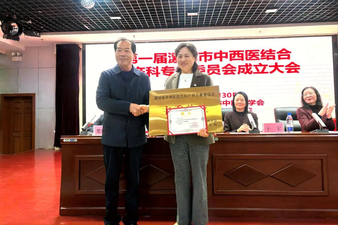 漯河市中醫(yī)藥學(xué)會(huì)理事長(zhǎng)陳來(lái)恩為漯河市中醫(yī)藥學(xué)會(huì)中西醫(yī)結(jié)合婦產(chǎn)科專業(yè)委員會(huì)的成立揭牌并給本次大會(huì)主任委員齊衛(wèi)頒發(fā)聘書。