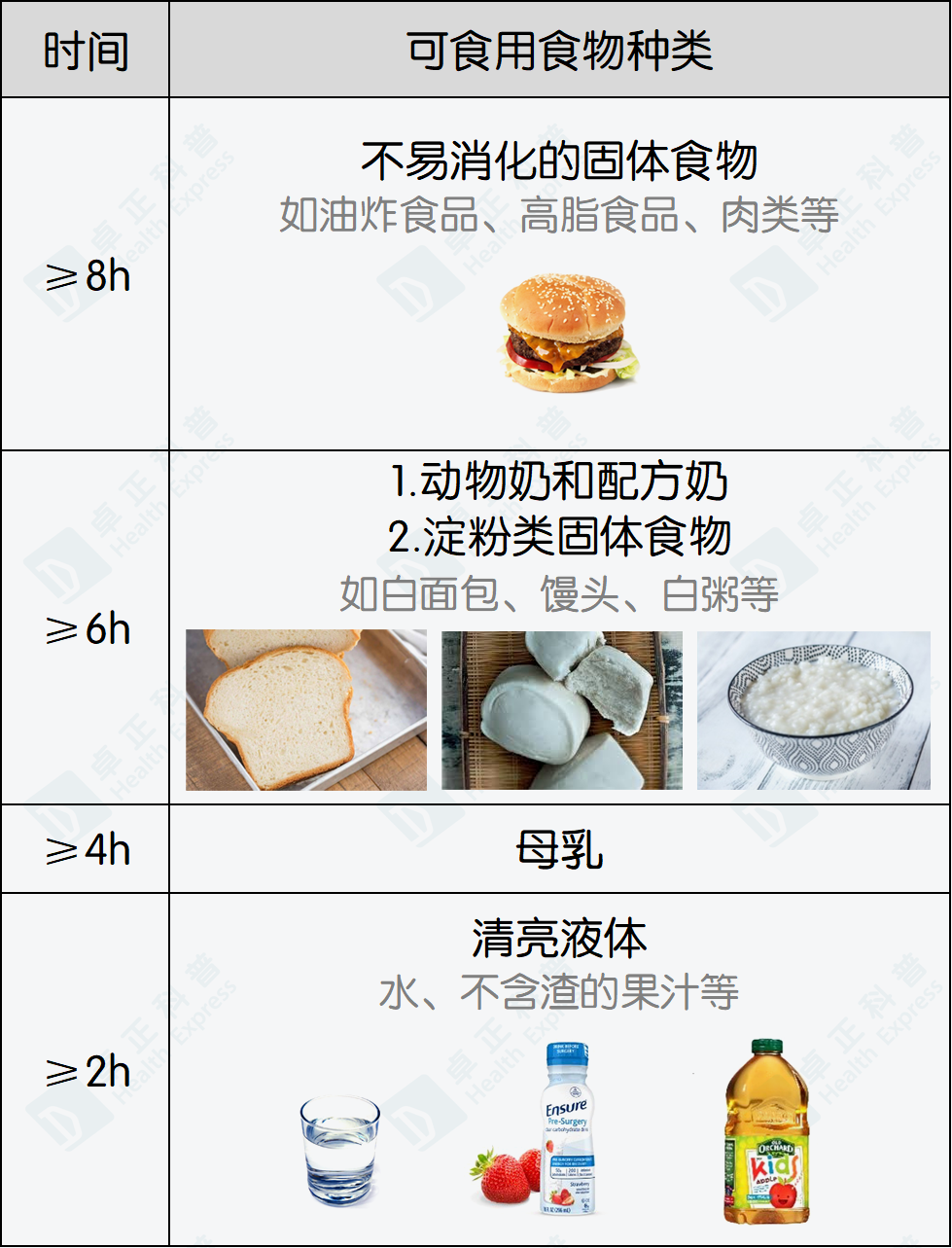 根據(jù)不同食物在胃里的“停留時(shí)間”不同,國內(nèi)相關(guān)指南規(guī)定,應(yīng)遵循“2-4-6-8”原則: