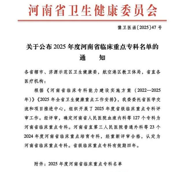 近日,河南省衛(wèi)生健康委發(fā)布《關(guān)于公布2025年度河南省臨床重點(diǎn)名單的通知》(豫衛(wèi)醫(yī)函〔2025〕47號(hào)),漯河醫(yī)專二附院(漯河市骨科醫(yī)院、漯河市立醫(yī)院)運(yùn)動(dòng)醫(yī)學(xué)科與護(hù)理??瞥晒νㄟ^評(píng)審被確定為河南省臨床重點(diǎn)專科。漯河醫(yī)專二附院再添兩個(gè)省級(jí)臨床重點(diǎn)???,標(biāo)志著這兩大專科在醫(yī)療技術(shù)、科研創(chuàng)新、服務(wù)質(zhì)量及區(qū)域影響力等方面達(dá)到省內(nèi)領(lǐng)先水平。