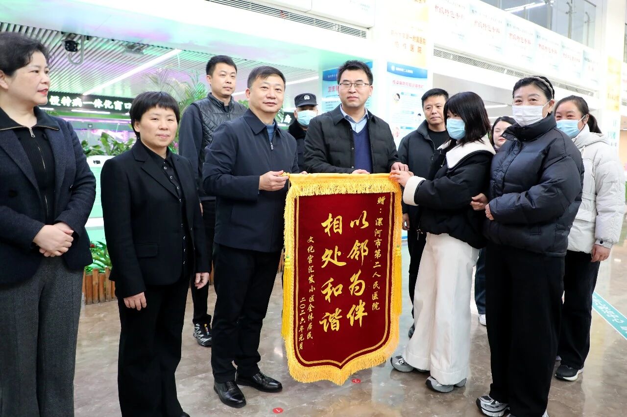 1月9日上午,市工人文化宮匯發(fā)小區(qū)業(yè)主代表專程來到市二院,送上印著“以鄰為伴 相處和諧”的錦旗,以此誠摯感謝我院妥善化解鄰里糾紛、用心解決群眾難題的擔當形象。院黨委書記魏松,黨委副書記、院長胡海英、副院長劉橋攜相關職能科室負責人熱情接待,源匯區(qū)老街辦事處黨工委書記來風、黨工委副書記譚春華及老街辦事處新華街社區(qū)工作人員到場見證此次溫情時刻。