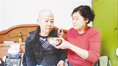 邵桂梅給丈夫郭建喂飯。