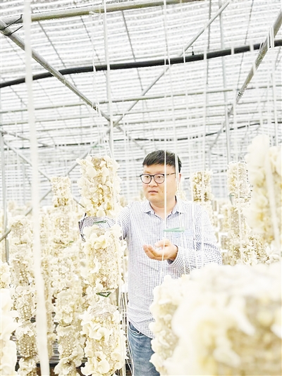 賈云鵬在大棚觀察白玉木耳長(zhǎng)勢(shì)。