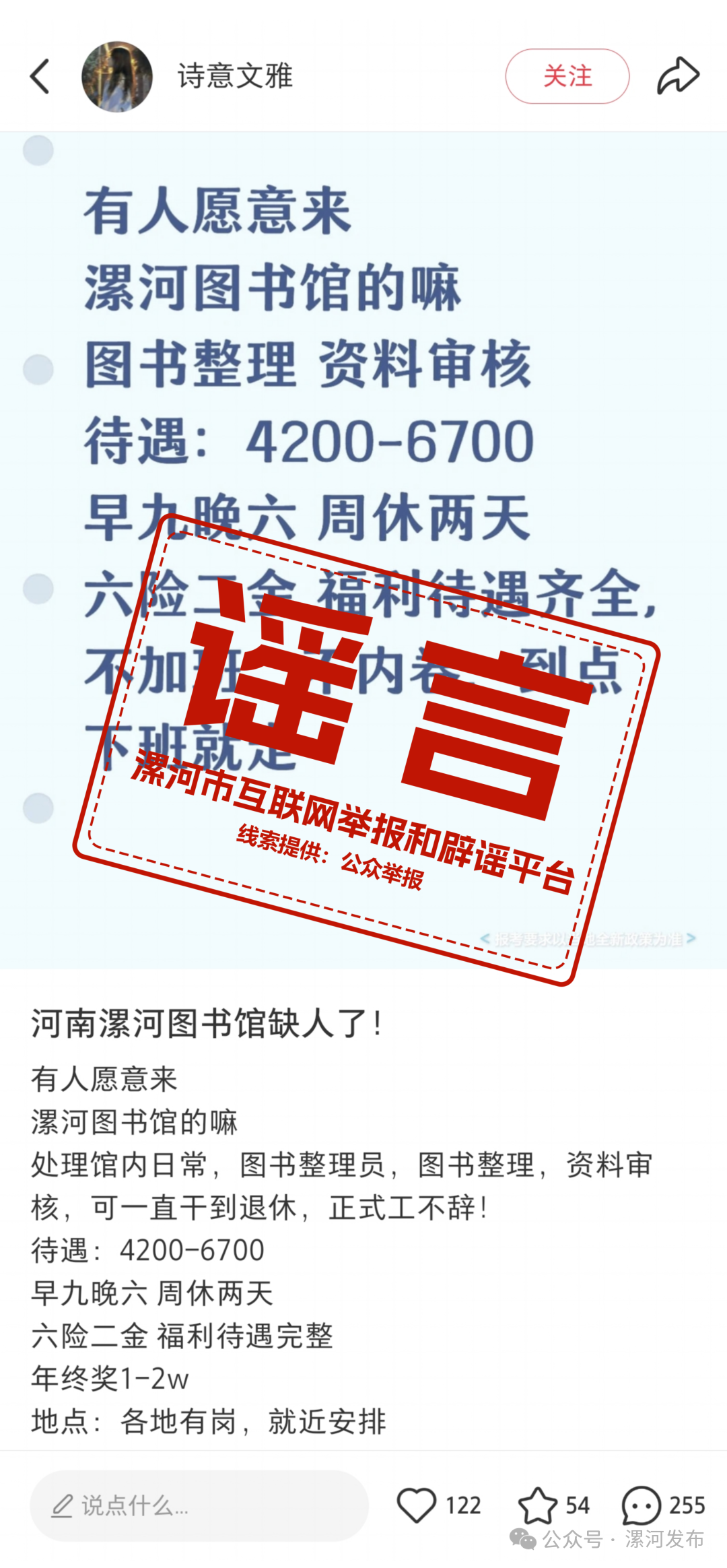經(jīng)向相關(guān)部門核實,漯河市圖書館并未發(fā)布此類招聘信息,該內(nèi)容系不法分子編造的虛假信息。據(jù)了解,漯河市圖書館所有招募、培訓、合作洽談等官方信息,均通過漯河市人力資源和社會保障局網(wǎng)站、漯河市文化廣電和旅游局網(wǎng)站統(tǒng)一發(fā)布,漯河市圖書館從未授權(quán)任何自媒體平臺、商業(yè)網(wǎng)站、個人及第三方機構(gòu)以漯河市圖書館名義開展招聘及各類招錄相關(guān)活動。