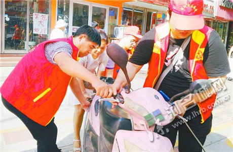 志愿者在馬路街對商戶落實“門前三包”情況進行督導,發(fā)現(xiàn)問題現(xiàn)場解決。 漯河日報全媒體記者 范子恒 攝
