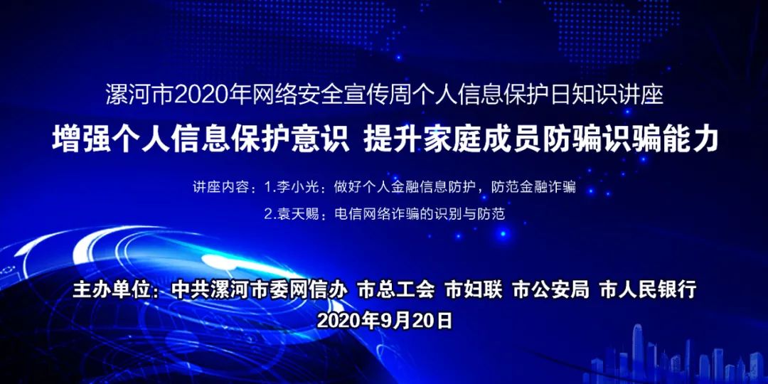 為推動(dòng)漯河市網(wǎng)絡(luò)安全宣傳周個(gè)人信息保護(hù)日主題活動(dòng)深入開展,結(jié)合生活中個(gè)人金融信息、電信信息容易被竊取的問題,幫助廣大家庭成員提升金融詐騙、電信網(wǎng)絡(luò)詐騙的防騙識(shí)騙能力,中共漯河市委網(wǎng)信辦、市總工會(huì)、市婦聯(lián)、市公安局、市人民銀行聯(lián)合舉辦“保護(hù)個(gè)人信息安全、提升防騙識(shí)騙能力”直播授課。