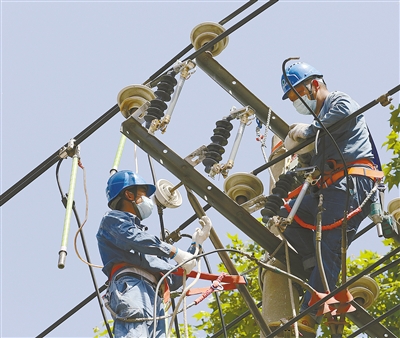 電力施工人員在對農(nóng)村電網(wǎng)進行改造。
