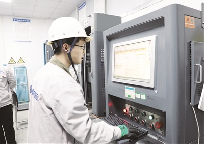 平漯周高鐵中鐵五局站前四標(biāo)項(xiàng)目部中心試驗(yàn)室鋼筋力學(xué)室內(nèi),試驗(yàn)員正在對(duì)螺紋鋼筋物理力學(xué)性能進(jìn)行檢測(cè)。記者 范子恒 攝